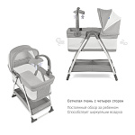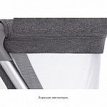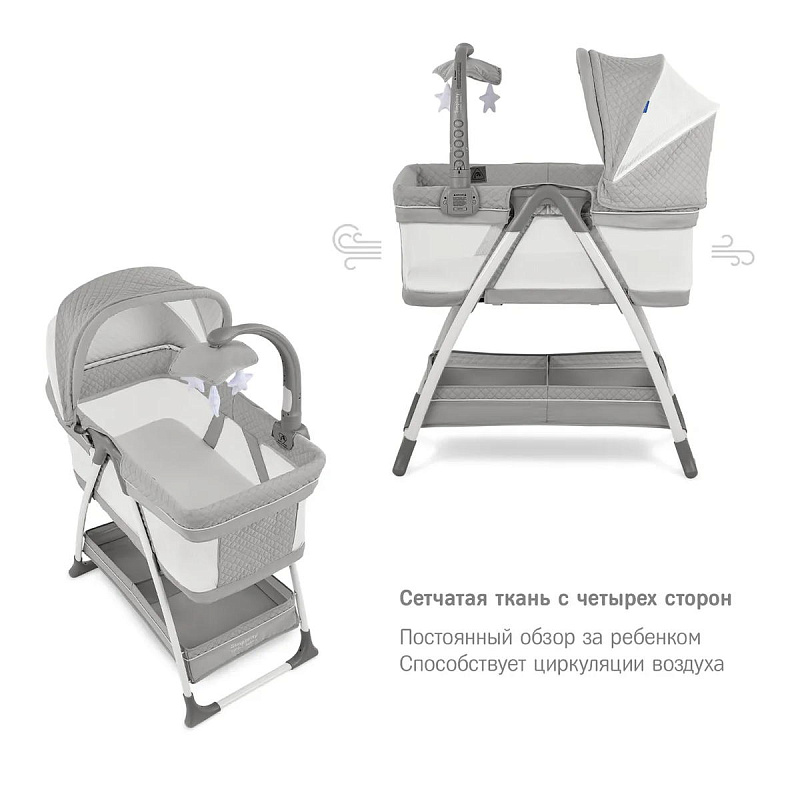 Колыбель со множеством функций дополнена стенками из сетчатых вставок для лучшей вентиляции и возможности наблюдения за ребёнком. Модель с просторным спальным местом. Каркас закрыт мягкой накладкой в верхней части, а внутри расположен матрасик с простынкой на резинке. Складной капор защищает от света, имеет сетчатую вставку в среднем отсеке. Конструкция изготовлена из алюминиевого профиля и ударопрочного пластика. Ножки-распорки снабжены нескользящими накладками, что обеспечивает колыбели хорошую устойчивость на любом напольном покрытии.