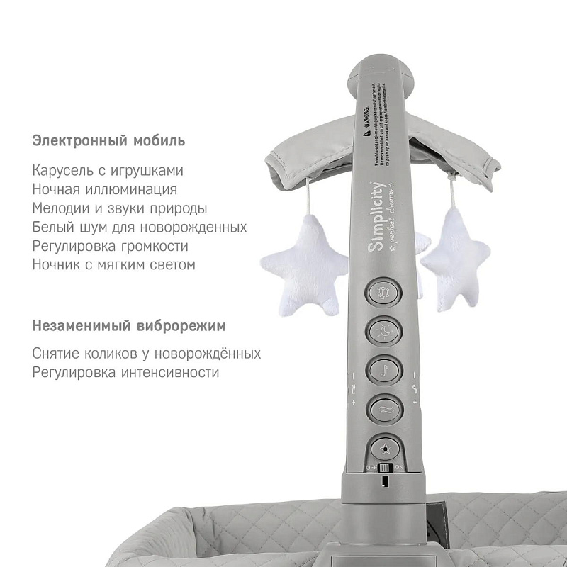 - мобиль выполняет множество функций: ночная подсветка, бегающие огоньки, виброукачивание, вращение игрушек и проигрывание мелодий