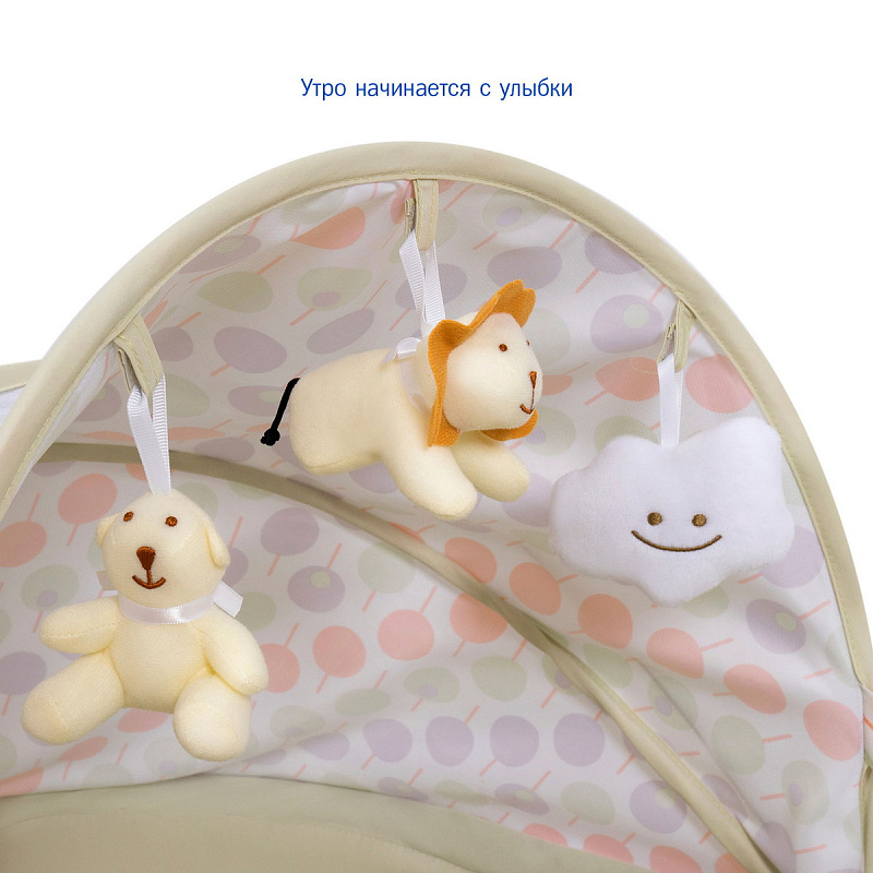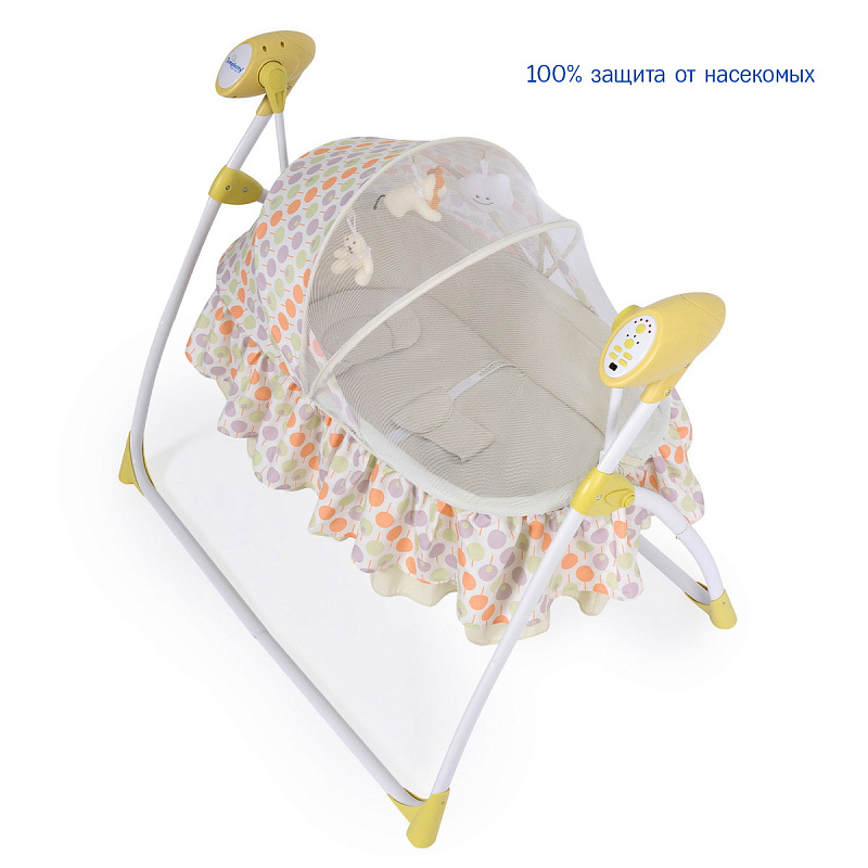 - Комплектация: колыбель, съёмный матрасик, подушка, капор, москитная сетка, 3 игрушки, пульт ДУ, адаптер