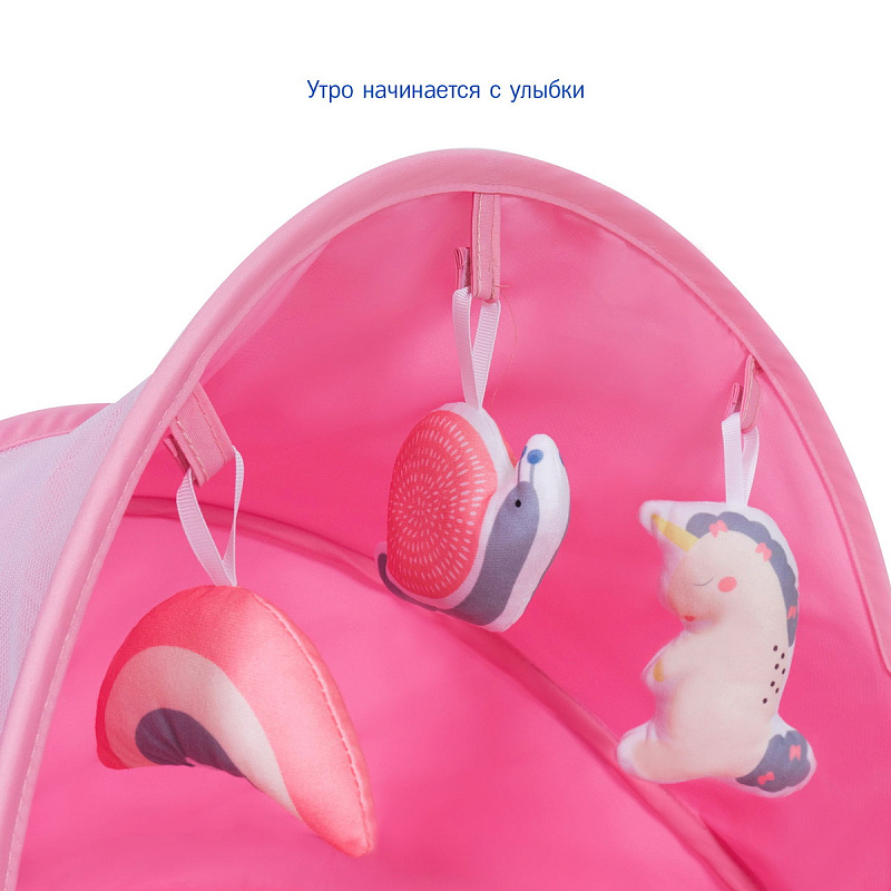 1 Кроватка для новорожденных. Прочная конструкция на устойчивых ножках, уютное спальное место и большой капор обеспечат условия для долгого, спокойного и безмятежного сна. Кроватка просторна и позволяет ребенку спать в любом удобном положении. В комплекте имеются матрасик и подушка. Защитить малыша от насекомых на открытом воздухе поможет москитная сетка, которая закрепляется на дуге капора