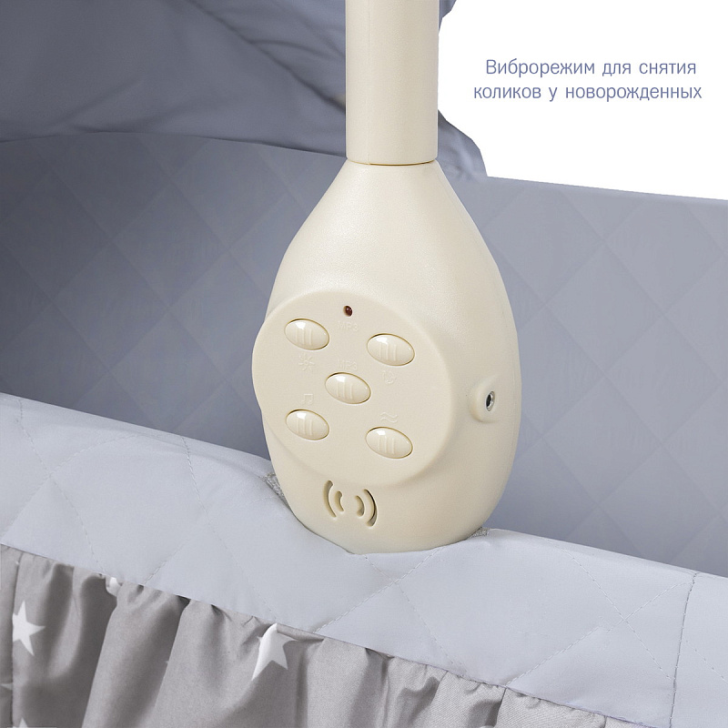 Кнопки на мобиле регулируют интенсивность вибрации, включают проигрывание музыкальных мелодий, заложенных в память устройства, и воспроизведение музыки в формате MP3. Одновременно можно запустить вращение подвесных игрушек и ночную подсветку. Имеется регулировка звучания по громкости.