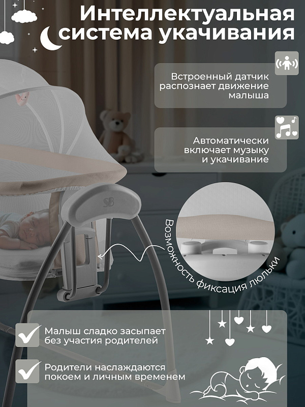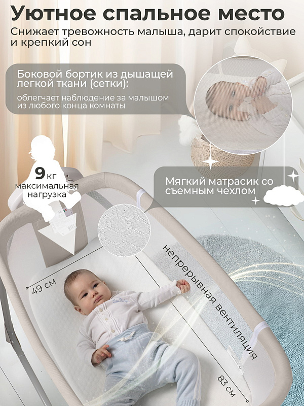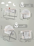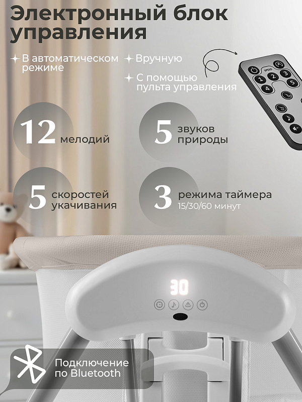 - 5 скоростей укачивания и 3 режима таймера: Настройте колыбель под индивидуальные потребности вашего ребенка, выбирая подходящую скорость укачивания и время работы.