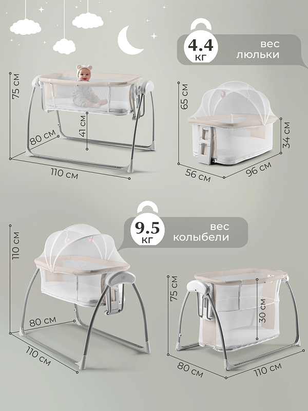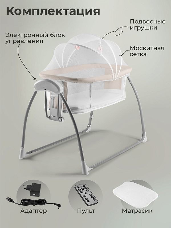 - Богатая комплектация: в комплект входят: пульт ДУ, адаптер, москитная сетка, подвесные игрушки, мягкий матрасик из хлопка, электронный блок управления.