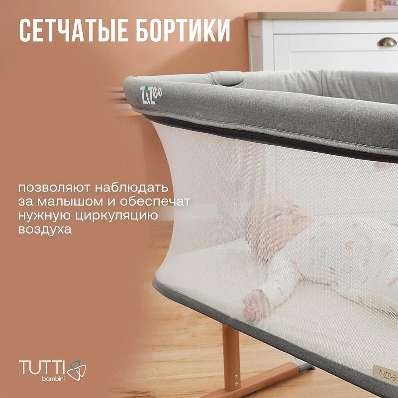 Нежная, легкая и компактная колыбель Tutti Bambini ZiZee с сетчатыми бортиками станет уютным местечком для сна новорожденного малыша в первые месяцы его жизни. Не секрет, что малыши чувствуют себя безопасно и комфортно в небольшом пространстве, похожим на мамин животик. Благодаря мобильным колесикам вы сможете перемещать колыбель из комнаты в комнату, чтобы кроха всегда был под присмотром.