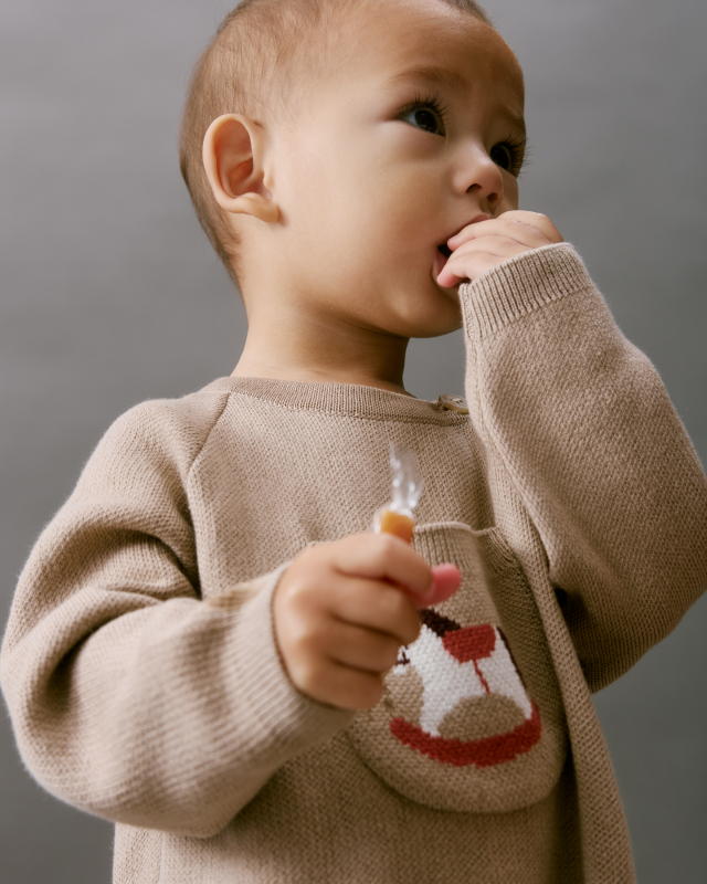 Полуприлегающий крой комфортно сидит по фигуре. Эластичная вязаная резиночка на горловине, манжетах и штанишках позволяет малышу комфортно ворочаться и ползать под елку за подарками. Боковая планка помогает маме быстро переодевать малыша, не отвлекая его от загадывания первых желаний.