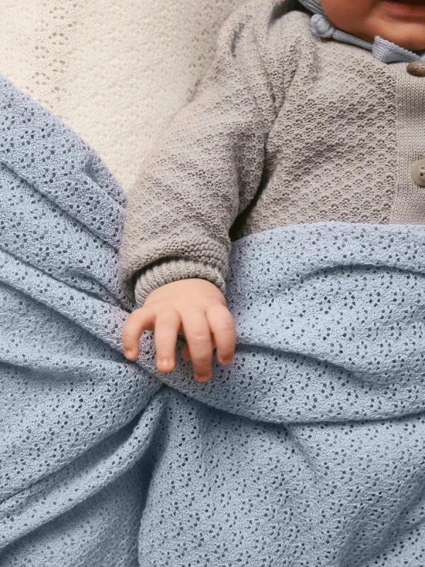 Хлопковые ниточки переплетаются в ажурном узоре, словно паутинки сновидений. Гипоаллергенная пряжа дарит малышу приятную тактильность, а маме — простой уход и долговечность после частых стирок.