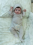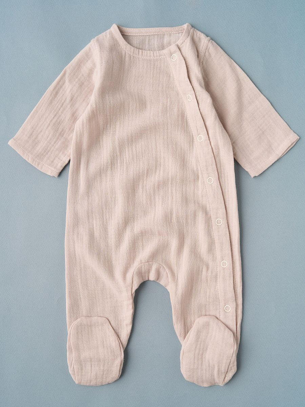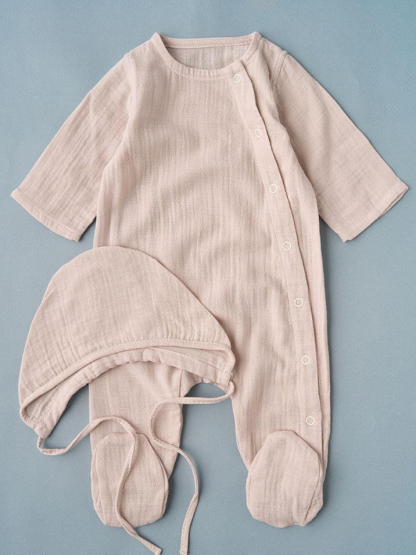 Комбинезон и чепчик из нежного муслина, на кнопках. Удобная модель, позволит легко и быстро переодевать малыша. Кнопки расположены на боковой части (с левой стороны), сверху донизу.