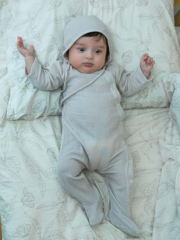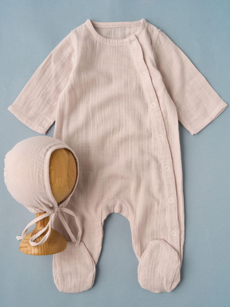 Комбинезон и чепчик из нежного муслина, на кнопках. Удобная модель, позволит легко и быстро переодевать малыша. Кнопки расположены на боковой части (с левой стороны), сверху донизу.