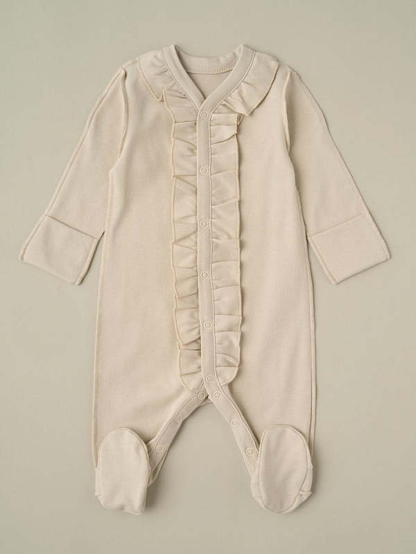 Комплект для новорождённого: комбинезон и чепчик с завязками из 100% хлопка, украшены нежными рюшами. Мягкий трикотаж, комбинезон на кнопках по всей длине для быстрого переодевания. В размерах 56 и 62 см — вшитые антицарапки и швы наружу для максимального комфорта. Идеально как комплект на выписку из роддома, для крестин/крещения, праздников и фотосессий.
