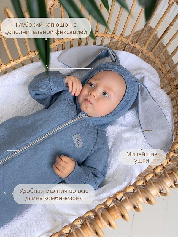 Комбинезон Little Star Зайка с капюшоном футер с начесом 30322 (ЧЗ-мз) серо-голубой 68