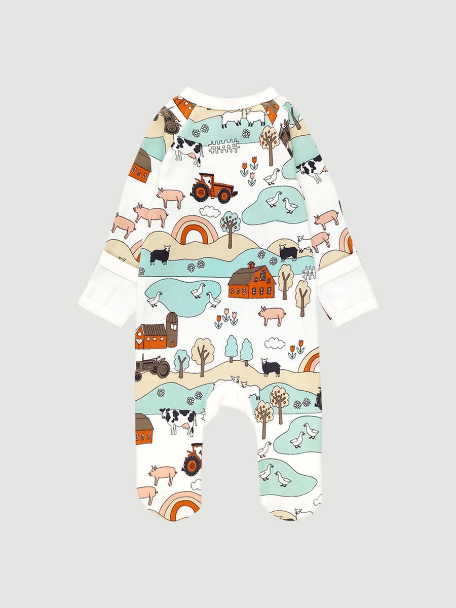Расцветка представлена в модели с рукавом «реглан» — когда принт находится на рукавах комбинезона, верхних сводах стопы и заполняет всю спинку. Принт с милыми поросятами, овечками, коровами и гусями подойдёт мальчикам и девочкам.