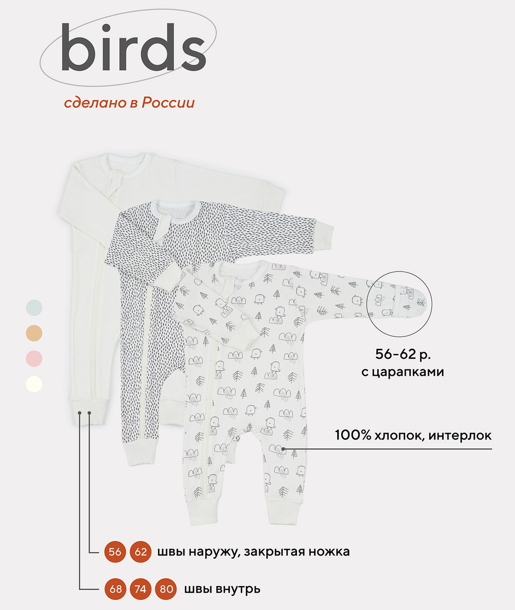 Комбинезон MowBaby Birds на молнии 3-шт 1282 Milk 62