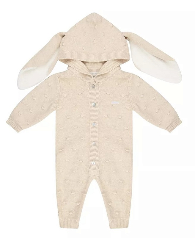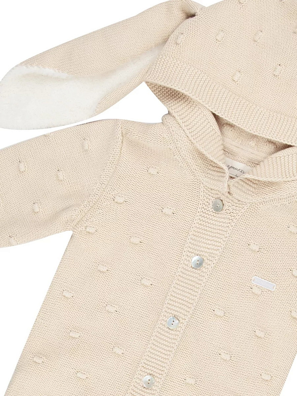 Комбинезон с капюшоном выполнен из вязаного хлопка, который придает нежность. Прекрасное дополнение для ежедневного (базового) гардероба Вашего малыша. Как самостоятельная детская одежда используется при температуре +10+20С! Материал мягкий, эластичный, приятный для нежной кожи ребенка, хорошо держит форму, не выгорает и не теряет цвет при стирках, позволяет телу дышать и легко впитывает влагу, обеспечивая максимальный комфорт. Капюшон украшен ушками, которые придают комбинезону милоту и нежность.