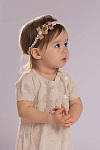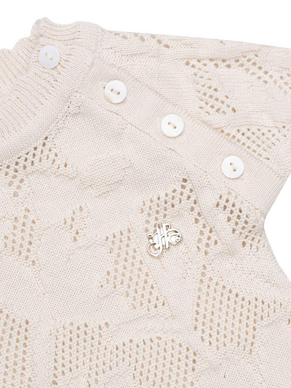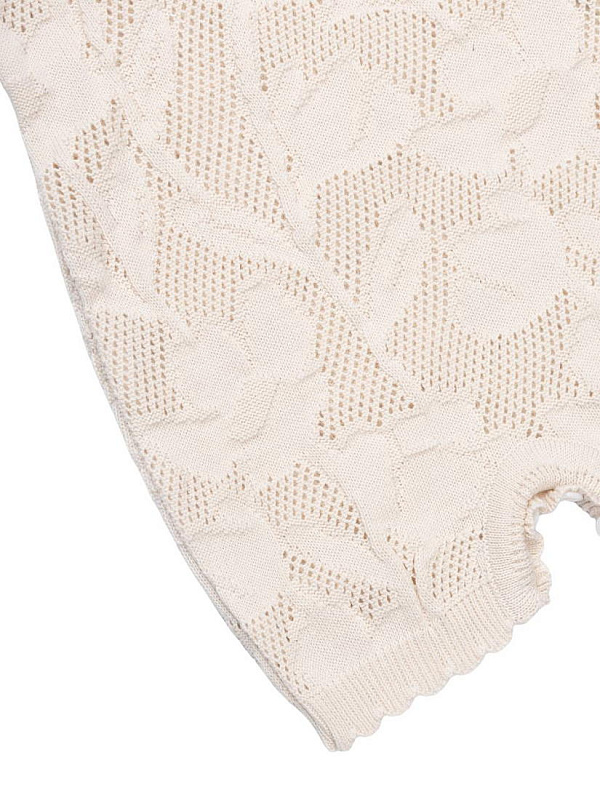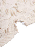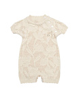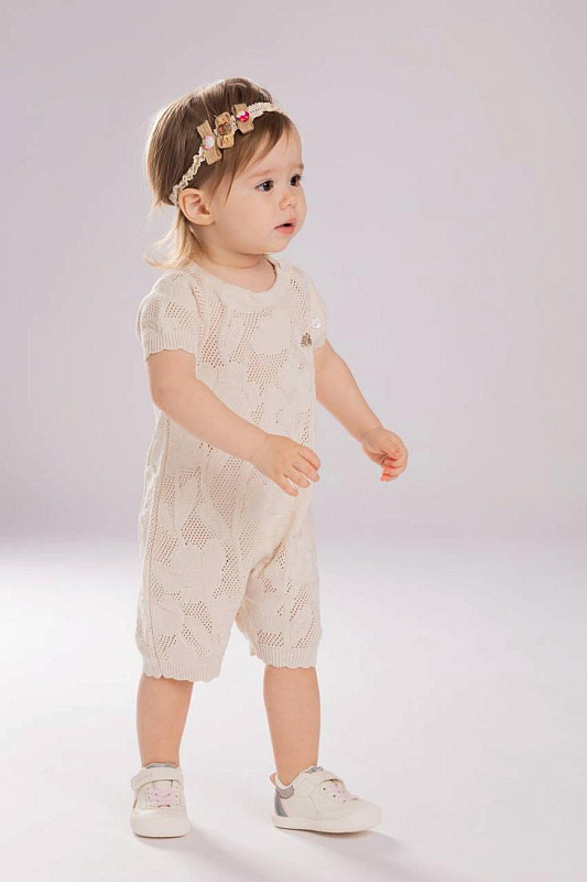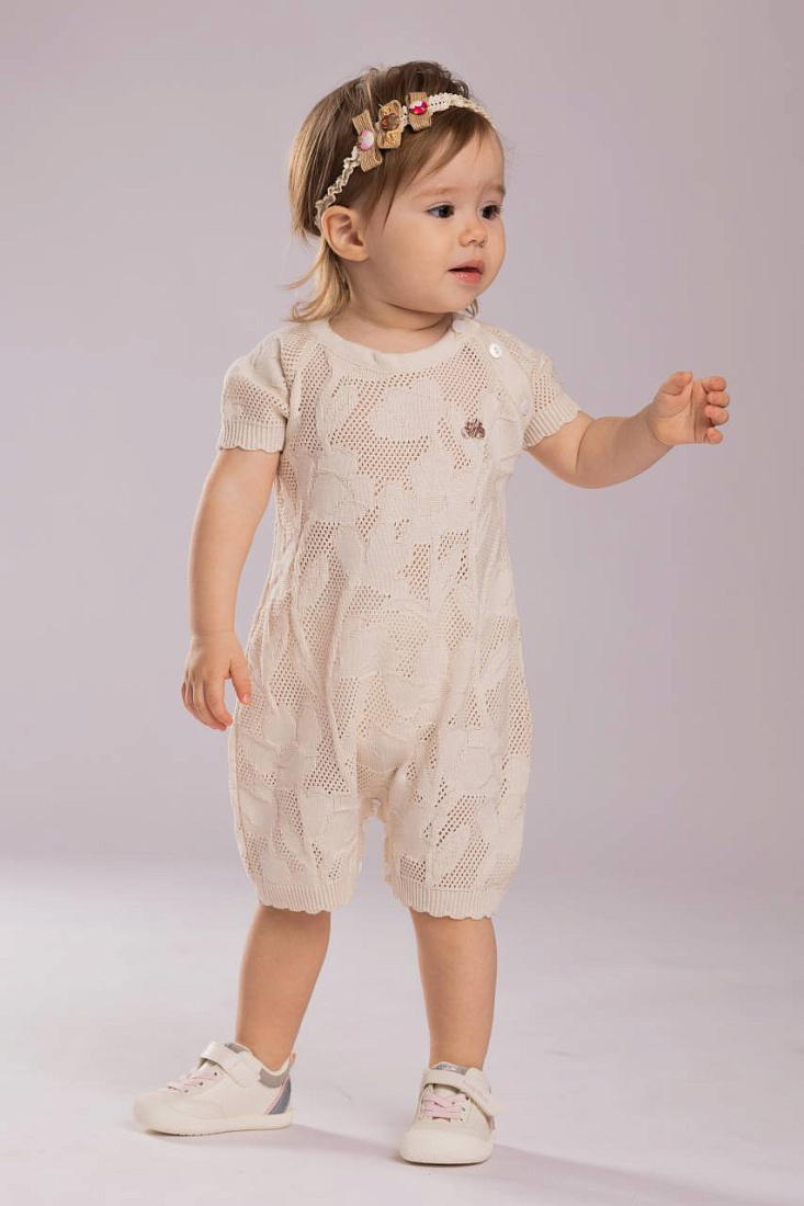Комбинезон для девочки выполнен в светлом оттенке и украшен изящным ажурным узором, напоминающим цветущий сад. Тонкая вязка создает легкую и воздушную текстуру, что идеально подходит для комфортного ношения в теплое время года. Материал на ощупь мягкий и приятный, что важно для нежной кожи девочки. Дизайн комбинезона отличается короткими рукавами и аккуратным воротником с волнистым краем, придающим образу утонченность. На плече расположены небольшие пуговицы, которые облегчают процесс переодевания и делают изделие практичным для родителей. В нижней части предусмотрены дополнительные застежки, обеспечивающие удобство при смене подгузника. Основной декоративный элемент — объемный цветочный рисунок, гармонично вплетенный в структуру ткани, благодаря чему комбинезон смотрится нарядно и свежо. Края рукавов и штанин обработаны аккуратной резинкой, которая хорошо держит форму и не сковывает движения ребенка.