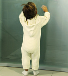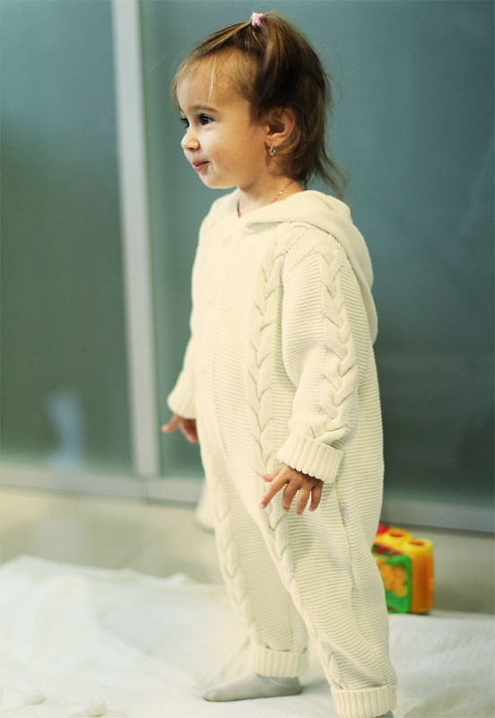 Вязаный комбинезон выполнен из приятной на ощупь ткани. Модель застегивается спереди на пуговицы, стопы открыты, есть капюшон. Перед ноской рекомендуется стирка.