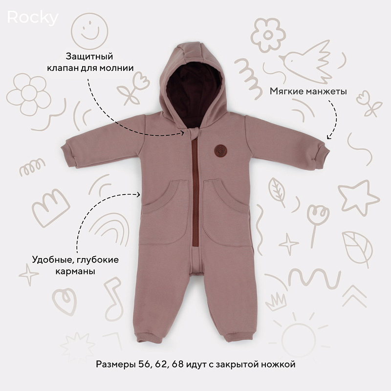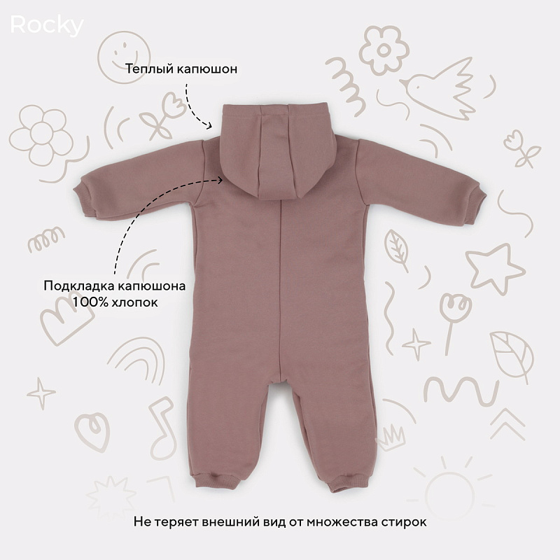 - комбинезон выполнен из гипоаллергенных и невероятно приятных на ощупь тканей. Основной материал - нежный и теплый футер, подклад - интерлок-пенье
