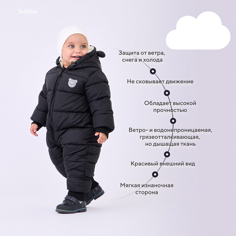 модель выполнена из плащевой ткани с покрытием soft touch. Подобный материал тактильно приятен, максимально долговечен, обладает высокой устойчивостью к механическим повреждениям, обладает водо-, ветронепроницаемыми и грязеотталкивающими свойствами, прекрасно сохраняет тепло и отводит влагу, а значит малыш не будет ни потеть, ни мерзнуть.