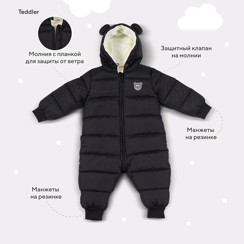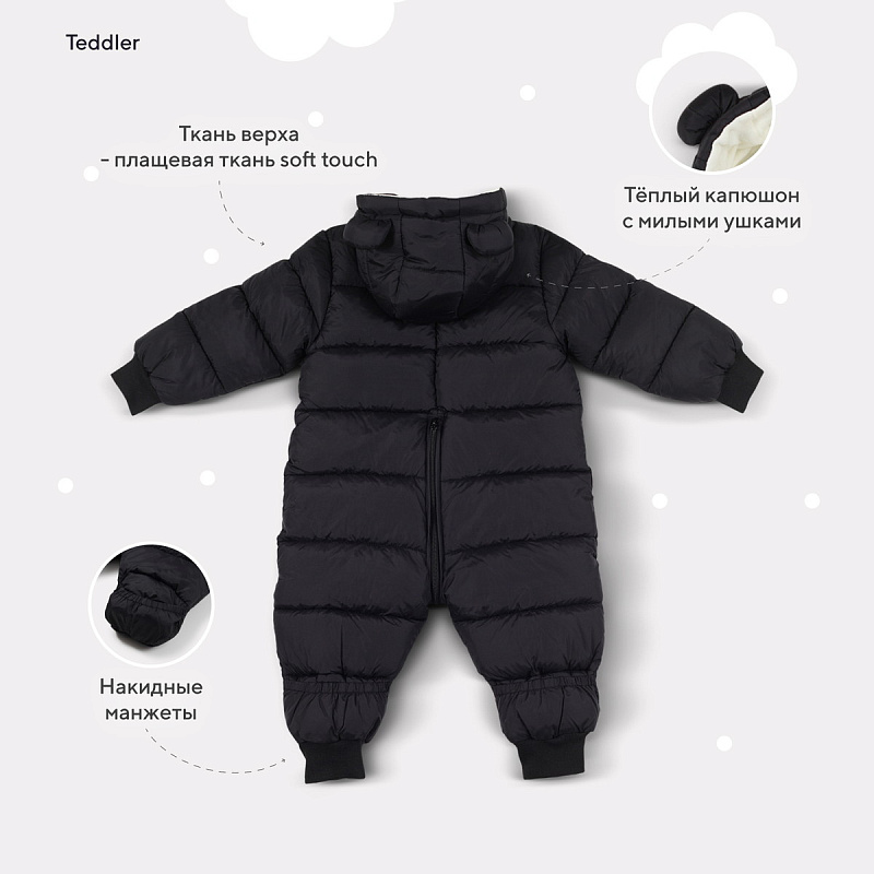 штанины дополнены накидными манжетами, защищающими от холода малыша, пока он не ходит самостоятельно