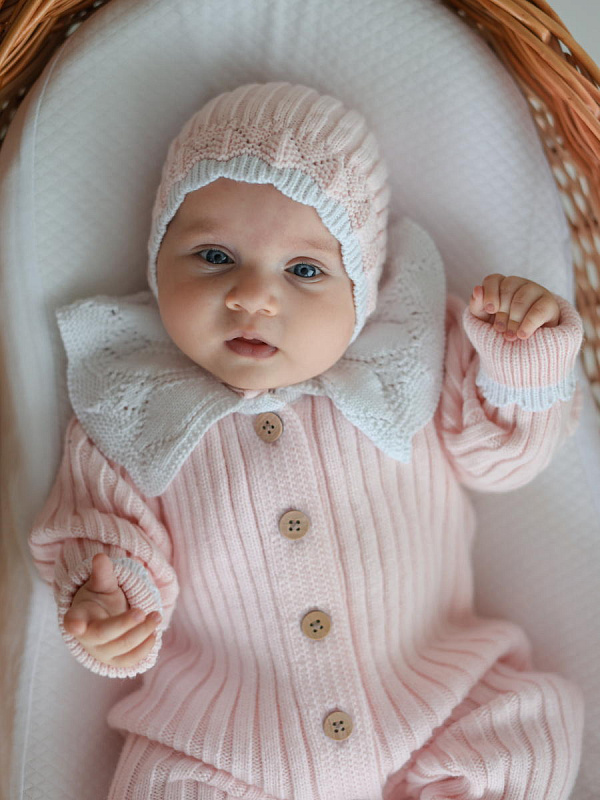 Вязаный рикотаж лапша, из которого изготовлен комплект для новорожденного, имеет свои преимущества: материал мягкий, эластичный, приятный для нежной кожи ребенка, хорошо держит форму, не выгорает и не теряет цвет при стирках, дышит и легко впитывает влагу, обеспечивая максимальный комфорт, имеет простой, естественный и эффектный вид.