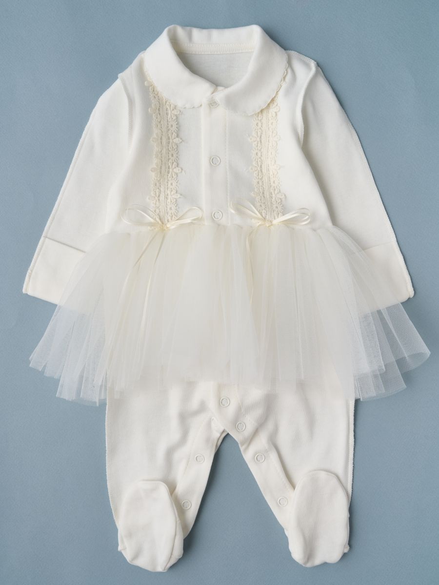 Комбинезон выполнен из мягкого хлопкового трикотажа и имеет застежку на кнопках. Имитация платья позволяет малышке выглядеть празднично, но не стесняет ее в движениях. Подойдет для выписки из роддома и для любого другого знаминательного события.