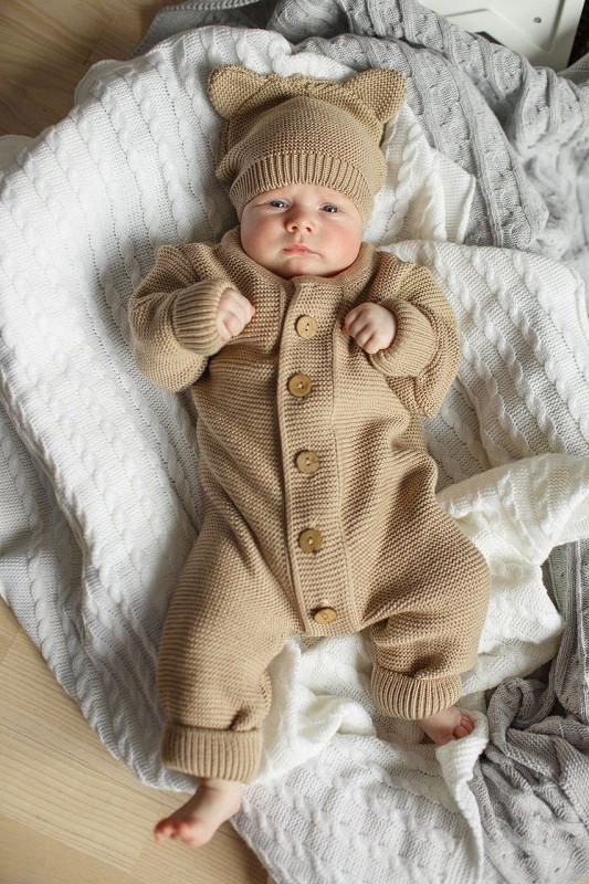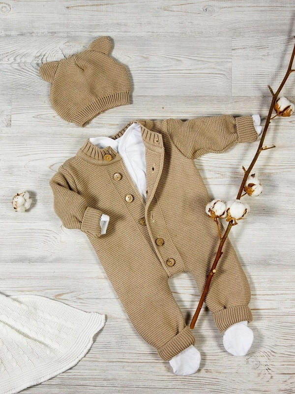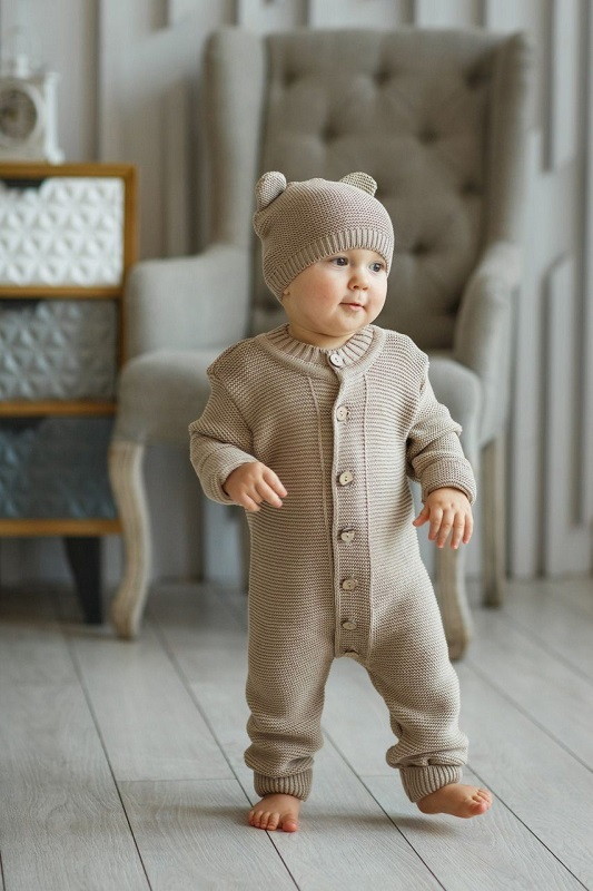 Комбинезон отлично подойдет как для нарядного выхода, так и может использоваться как поддева в холодное время года. Вязаная милая шапочка станет отличным дополнением к образу. Комбинезон является универсальной вещью, которую легко надевать на ребенка, в нем удобно малышу и спокойно маме.