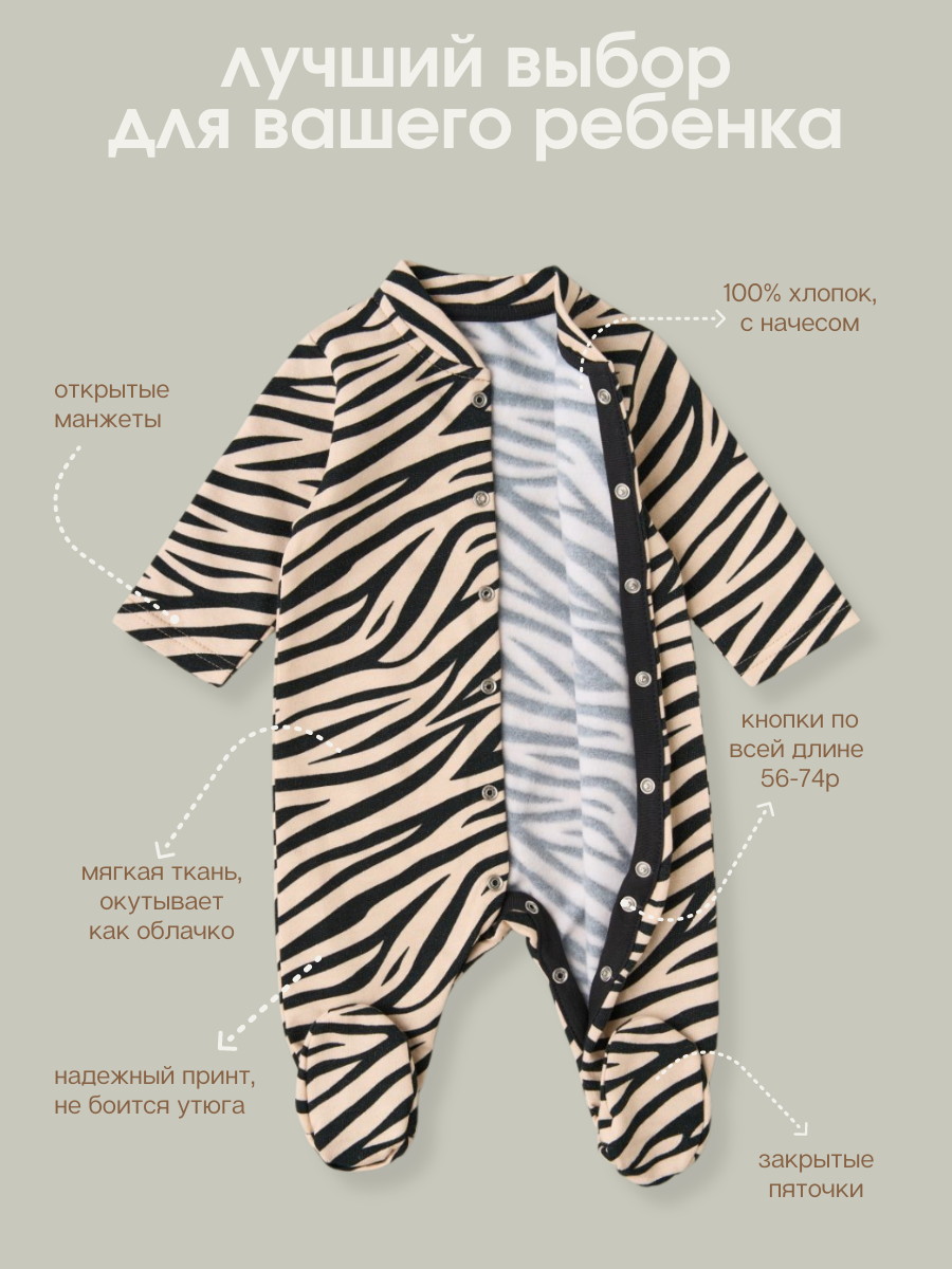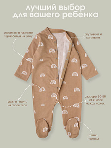 Комбинезон из нежного трикотажа на кнопках. Удобная модель, позволит легко и быстро переодевать малыша. Кнопки расположены по центру, сверху донизу. Также, для удобства смены подгузника, мы предусмотрели кнопочки и между ножек.