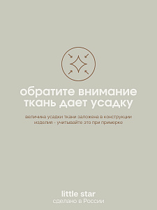 Обратите внимание, ткань при первой стирке садится на 3 см, это заложено в конструкции, учитывайте данный факт при примерке изделия