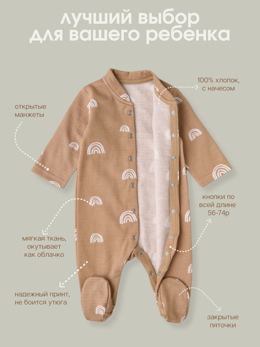 Комбинезон из нежного трикотажа на кнопках. Удобная модель, позволит легко и быстро переодевать малыша. Кнопки расположены по центру, сверху донизу. Также, для удобства смены подгузника, мы предусмотрели кнопочки и между ножек.