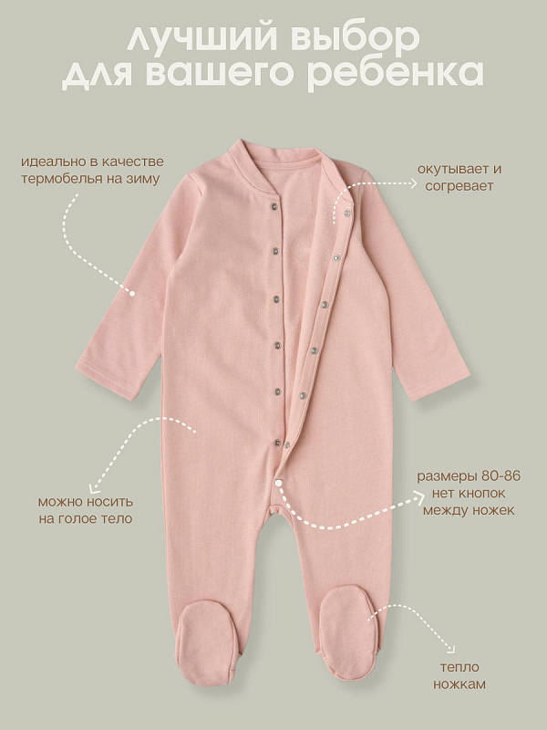 Комбинезон из нежного трикотажа на кнопках. Удобная модель, позволит легко и быстро переодевать малыша. Кнопки расположены по центру, сверху донизу. Также, для удобства смены подгузника, мы предусмотрели кнопочки и между ножек.