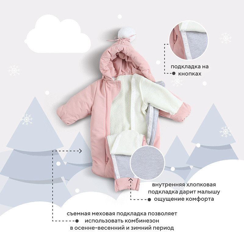 съемная меховая подкладка позволяет использовать комбинезон как в осенне-весенний, так и в зимний период