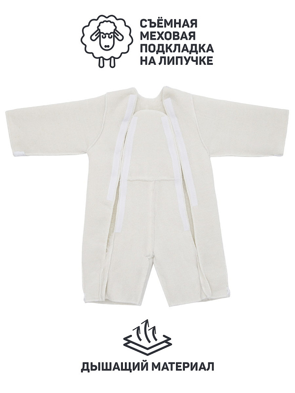 - Изготовлен из водонепроницаемого, не продуваемого материала и утеплен съемной подкладкой, в составе которой натуральная овчинная шерсть.