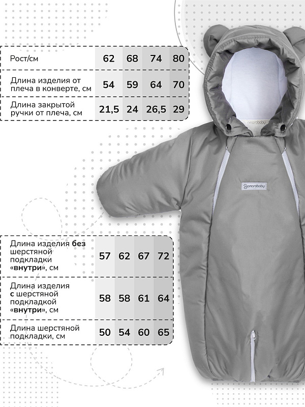 В комбинезоне – трансформере можно легко пристегнуть ребенка в автолюльке.Стильный и функциональный комбинезон - трансформер рассчитан на холода до -25 °С и состоит из трех защитных слоев: непромокаемого верха, плотного утеплителя и отстегивающейся подкладки из меха с натуральной шерстью. Комбинезон легко трансформируется в конверт (идеально подойдет новорожденным). Вы можете снять меховую подкладку и использовать конверт осенью/весной. Отвороты на рукавах не дадут замерзнуть маленьким ручкам. В комплекте идут утепленные отстегивающиеся пинетки.Зимний меховой комбинезон-трансформер AMAROBABY коллекции Snowy Baby - незаменимая и удобная вещь для прогулок с ребенком в холодное время года.