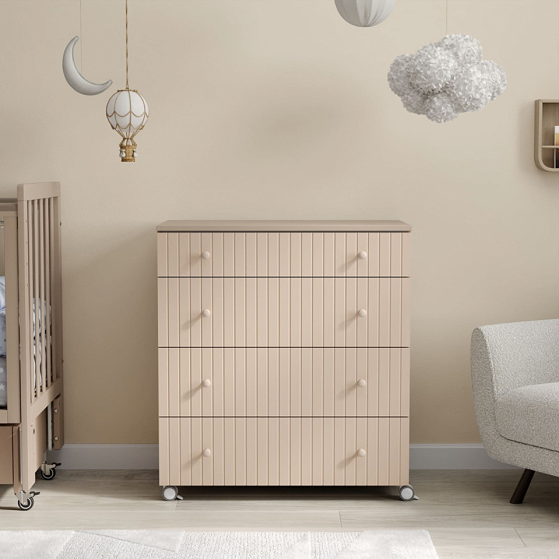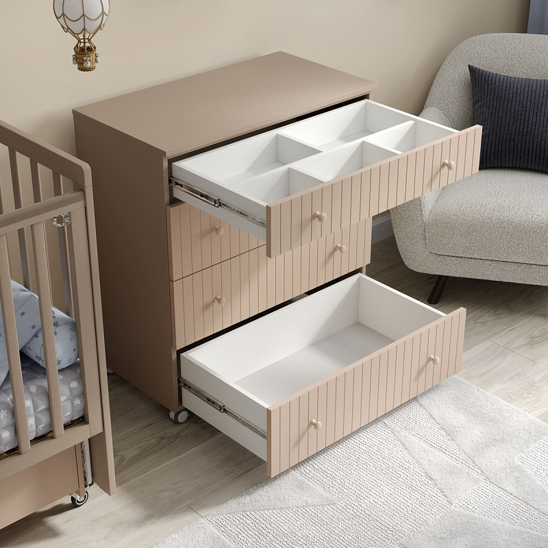 - Фасады имеют вертикальную фрезеровку, которая придает комоду дополнительного шарма.