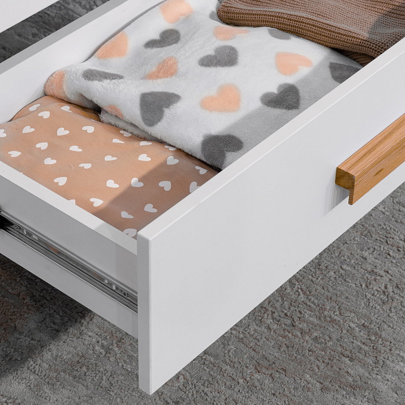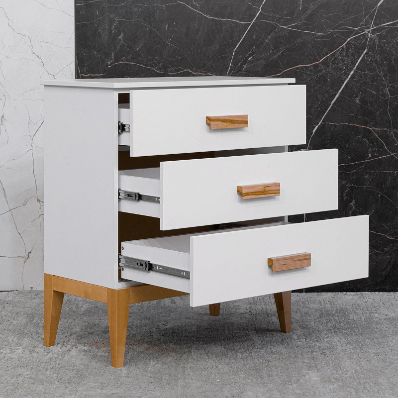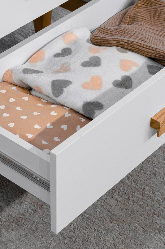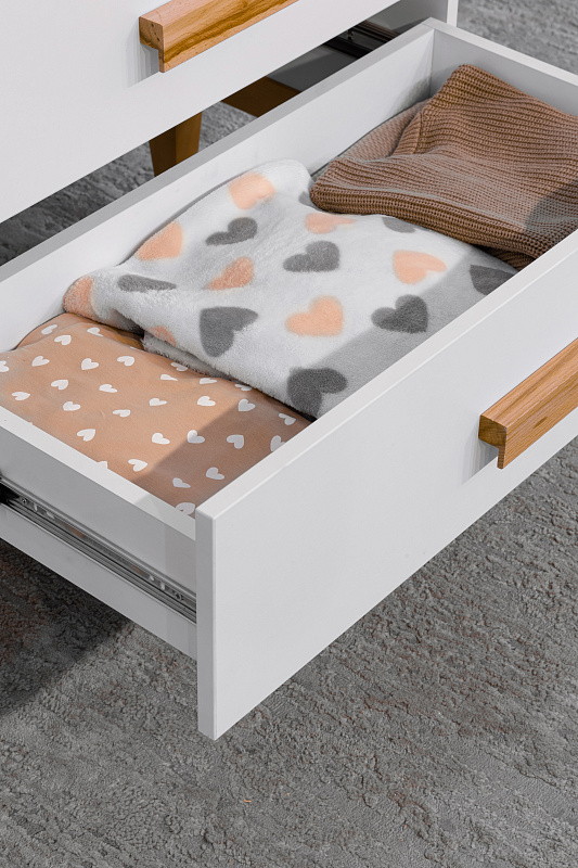 Три выдвижных ящика, оснащенные телескопическими направляющими полного выдвижения, предоставляют удобный доступ к содержимому, позволяя организовать пространство максимально эффективно. Независимо от того, храните ли вы вещи для ребенка или повседневные мелочи, данный комод поможет поддерживать порядок и уют в вашем доме.