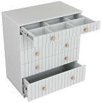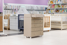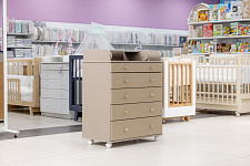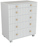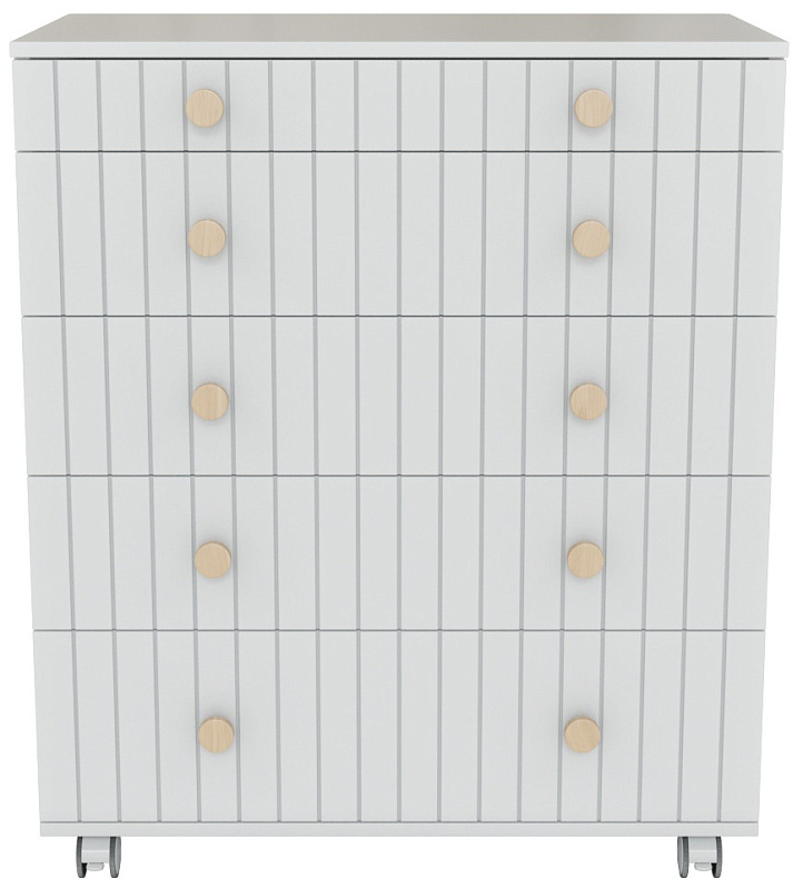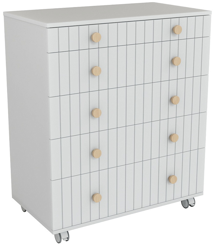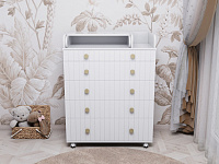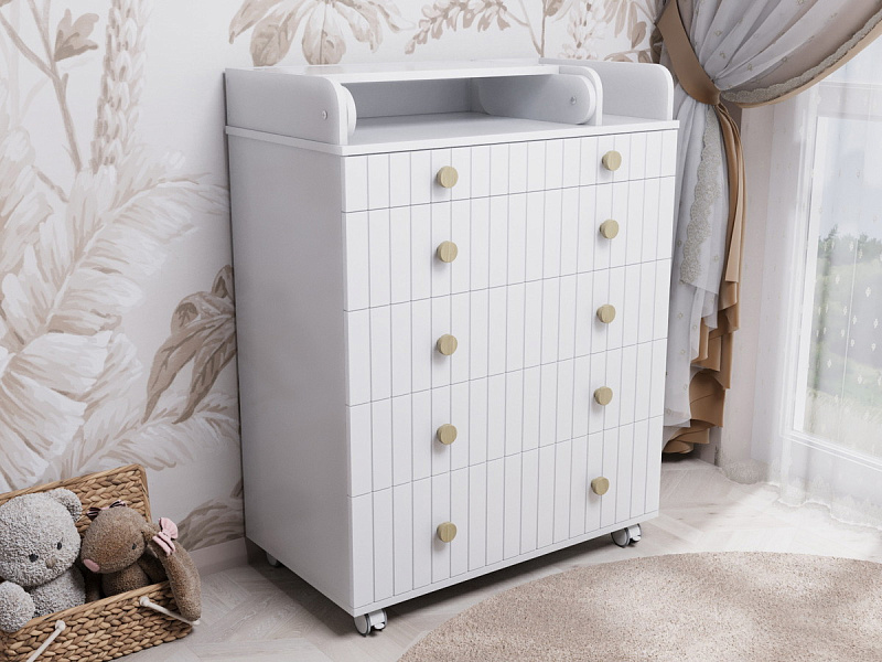 Комод "Charm" с пятью ящиками – воплощение функциональности и уюта. Верхний ящик оснащен органайзером, обеспечивающим идеальный порядок. Откидной пеленатор превращает комод в удобное место для ухода за малышом. Легкое перемещение комода обеспечивают колесики. Изготовленный из МДФ и ЛДСП, он сочетает в себе прочность и эстетичный внешний вид. Шариковые направляющие ящиков гарантируют плавное и бесшумное скольжение.
