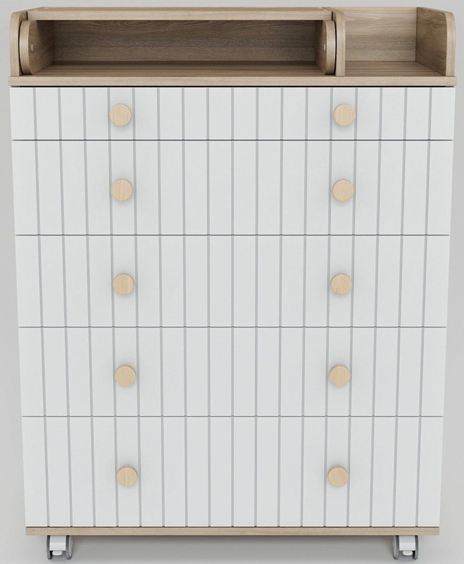 Комод "Charm" с пятью ящиками – воплощение функциональности и уюта. Верхний ящик оснащен органайзером, обеспечивающим идеальный порядок. Откидной пеленатор превращает комод в удобное место для ухода за малышом. Легкое перемещение комода обеспечивают колесики. Изготовленный из МДФ и ЛДСП, он сочетает в себе прочность и эстетичный внешний вид. Шариковые направляющие ящиков гарантируют плавное и бесшумное скольжение.