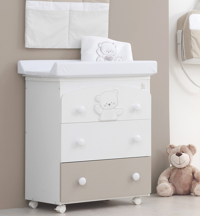 Лаконичный и очень выдержанный в общей стилистики коллекции, комод со съёмной пеленальной поверхностью и ящиками для постельных принадлежностей и одежды обитателя детской комнаты. Он выполнен в белом цвете, за исключением, панели нижнего ящика, которая своим цветом связывает его с другими предметами коллекции.