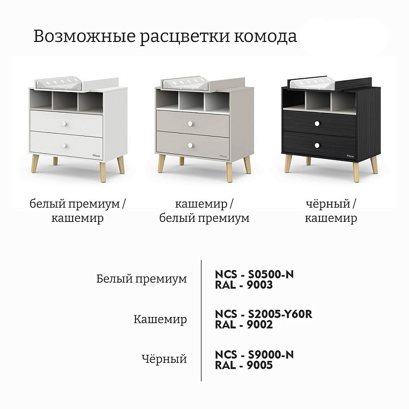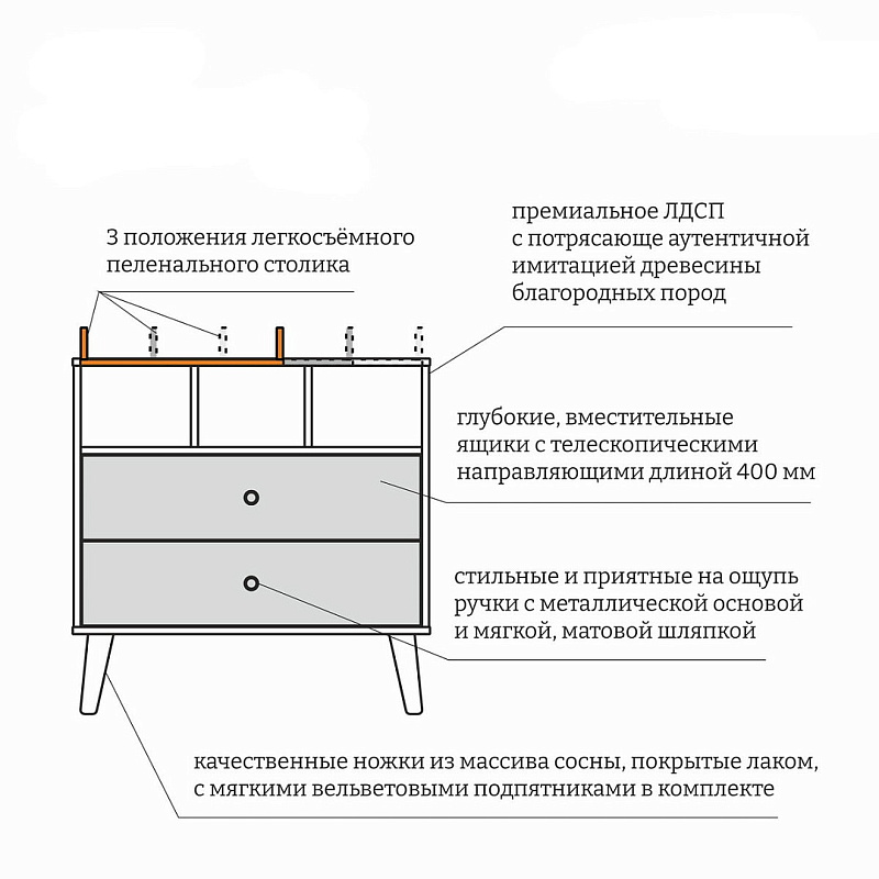 Ножки комода выполнены из массива сосны и покрыты безопасным лаком. В комплекте к ножкам есть мягкие фетровые подпятники, для защиты пола.