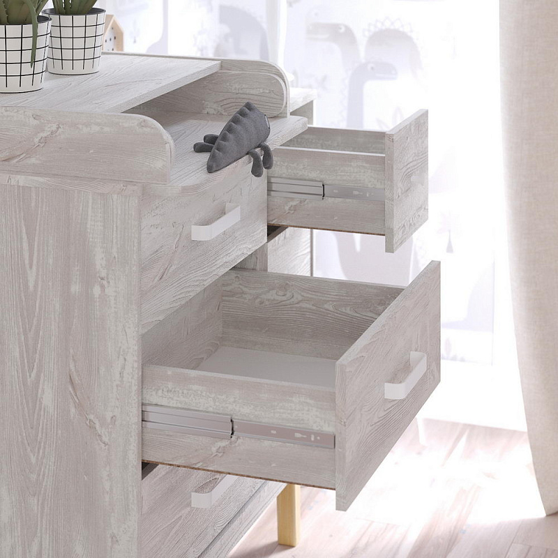 - пеленальный столик можно установит слева, справа или посередине комода, а когда он будет не нужен - снять и убрать. Но удобнее всего его устанавливать слева, тогда будет доступ к верхнему правому ящику при раскрытом пеленальном столике