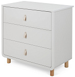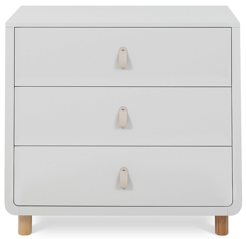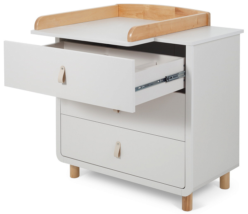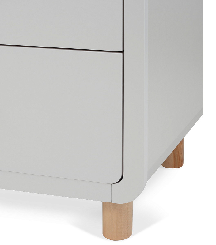 плавные линии бортика не только рифмуются с обтекаемым фасадом комода и ножками в форме цилиндров, но и обеспечивают безопасность (старший ребенок не наткнется на острый угол пеленальной накладки)