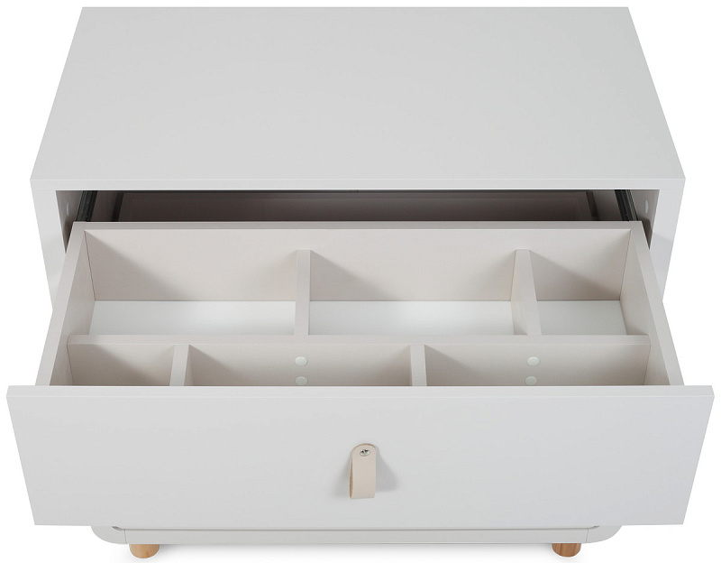 верхний ящик комода поделен на 6 разноформатных секций, куда так удобно сложить все необходимые вещи для ухода за младенцем (подгузники, одноразовые пеленки, детскую косметику для тела)