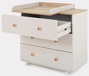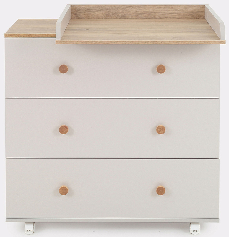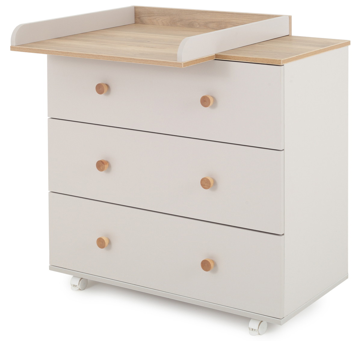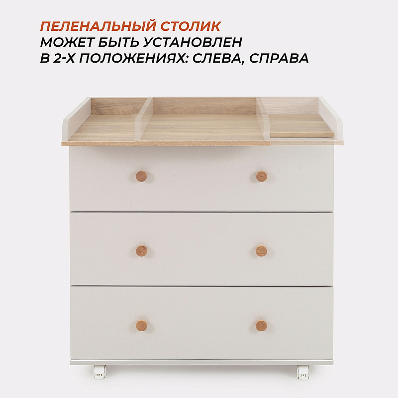 комод дополнен бортиком, превращающим его в полноценный пеленальный столик. Бортик можно установить в двух положениях - слева и справа.