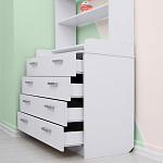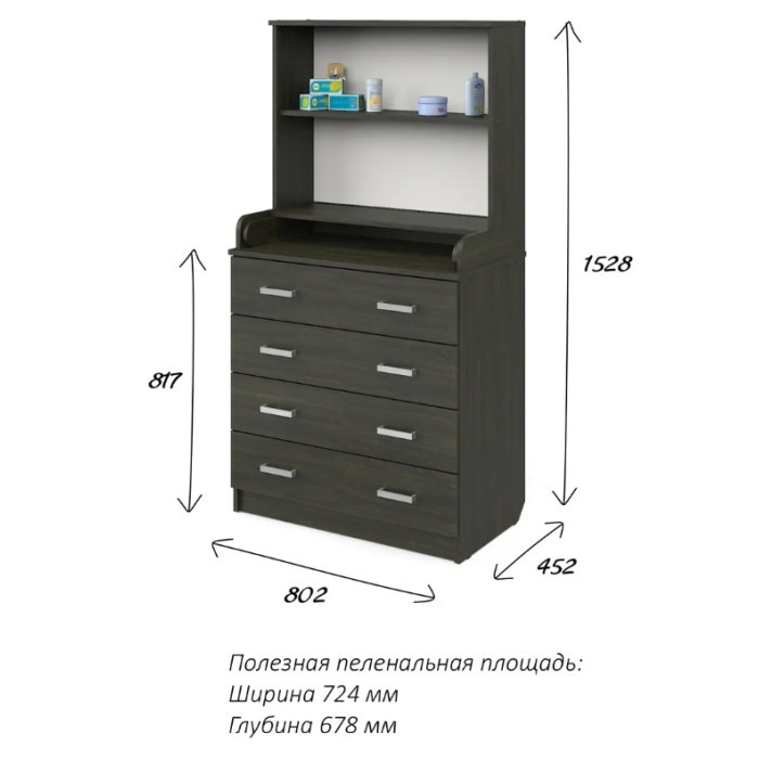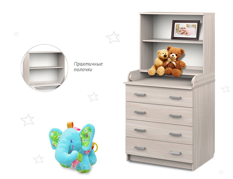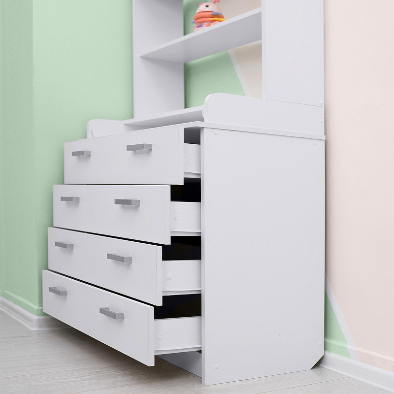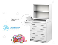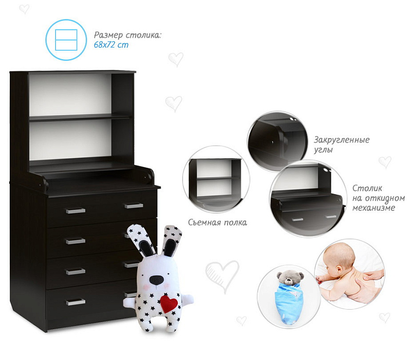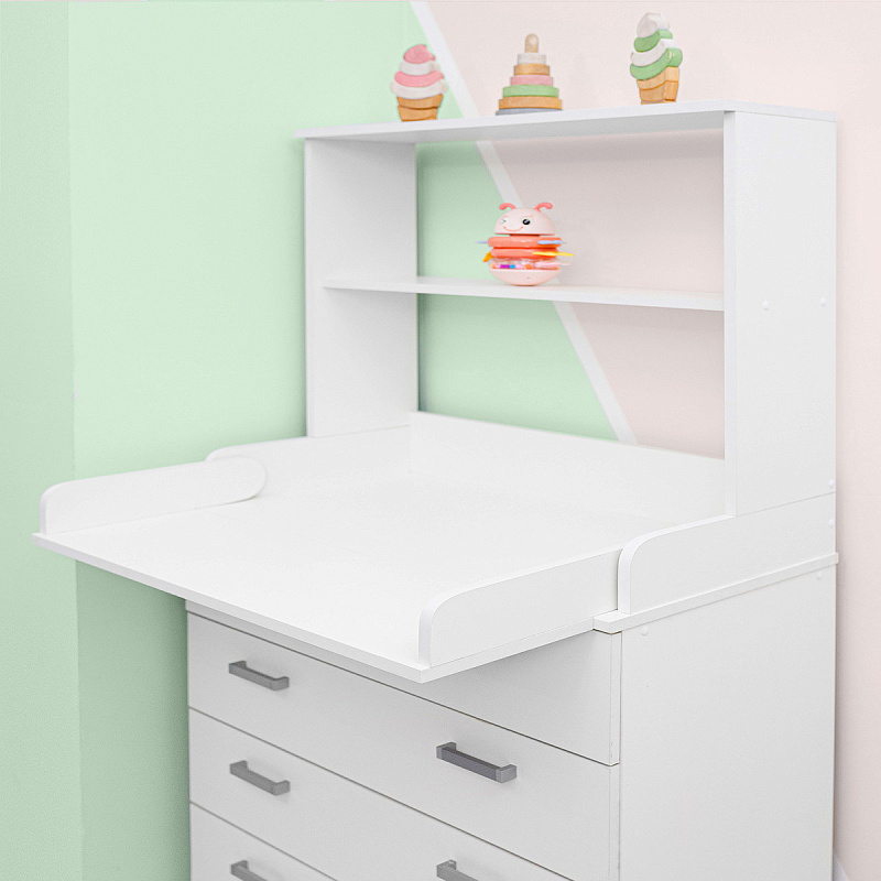 Пеленальный столик закреплен на подвижном откидном механизме высокой прочности, поэтому безопасность ребенка на нем во время пеленания, переодевания либо массажа гарантирована. Глубина пеленатора в разложенном состоянии: 70 см.Также для детской защиты выполнены боковые борты с закругленными углами. В сложенном состоянии пеленальный столик превращается в дополнительную полку и нишу для вещей. При желании полку можно снять.Кромка изделия создана из влагостойкого АБС-пластика итальянского производства, который, не смотря на свою эластичность, имеет повышенную ударопрочность. Благодаря этому мебель надолго сохранит свой внешний вид, идеальные углы. Мягкость материала снижает вероятность ушибов и болевых ощущений у ребенка при ударе о кромку.