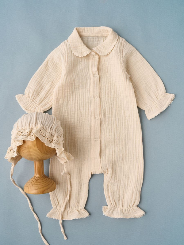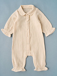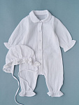 Комбинезон и чепчик из нежного муслина, застежка на кнопках. Удобная модель, позволит легко и быстро переодевать малыша. Кнопки расположены спереди, сверху донизу. Стопы открыты.