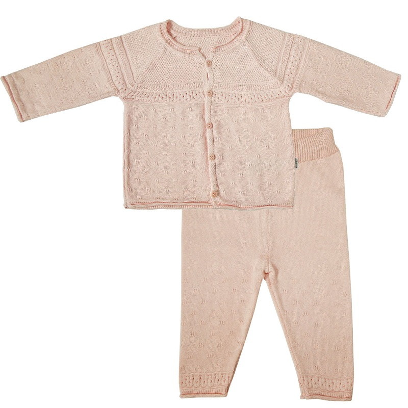 Вязаный комплект состоит из кофточки и штанишек. Комплект можно носить и летом, и зимой в любое время года ребенку в нем будет комфортно.