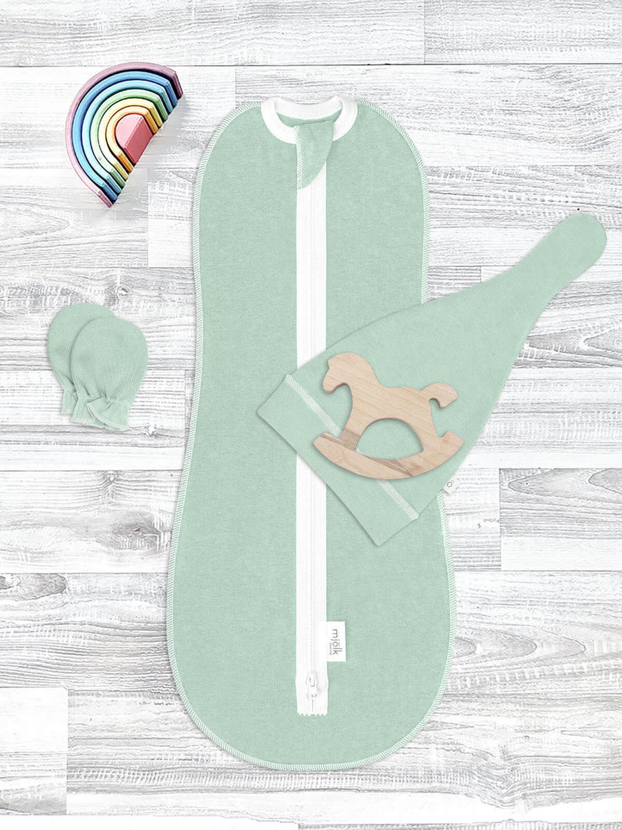 Комплект для новорождённого Mjolk Magic Mint пеленальный кокон, шапочка, антицарапки 56