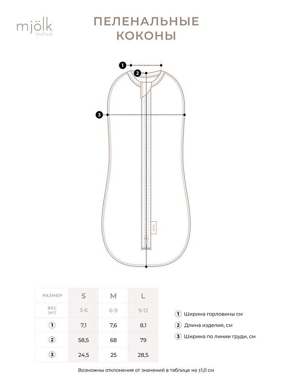 Кокон Mjölk изготовлен швами наружу, молния нашита сверху ткани так, чтобы не соприкасаться с кожей, а у шеи дополнительно защищена трикотажным языком. Пелёнку-кокон на молнии легко надеть, а наличие двух замков позволяет удобно сменить подгузник. В коконе ребёнок будет спокойно спать без возможности распеленаться и разбудить себя.
