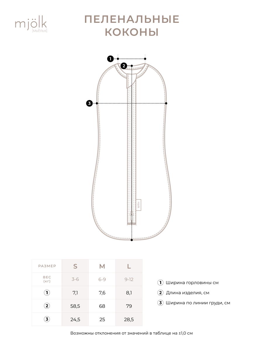 Кокон Mjölk изготовлен швами наружу, молния нашита сверху ткани так, чтобы не соприкасаться с кожей, а у шеи дополнительно защищена трикотажным языком. Пелёнку-кокон на молнии легко надеть, а наличие двух замков позволяет удобно сменить подгузник. В коконе ребёнок будет спокойно спать без возможности распеленаться и разбудить себя.
