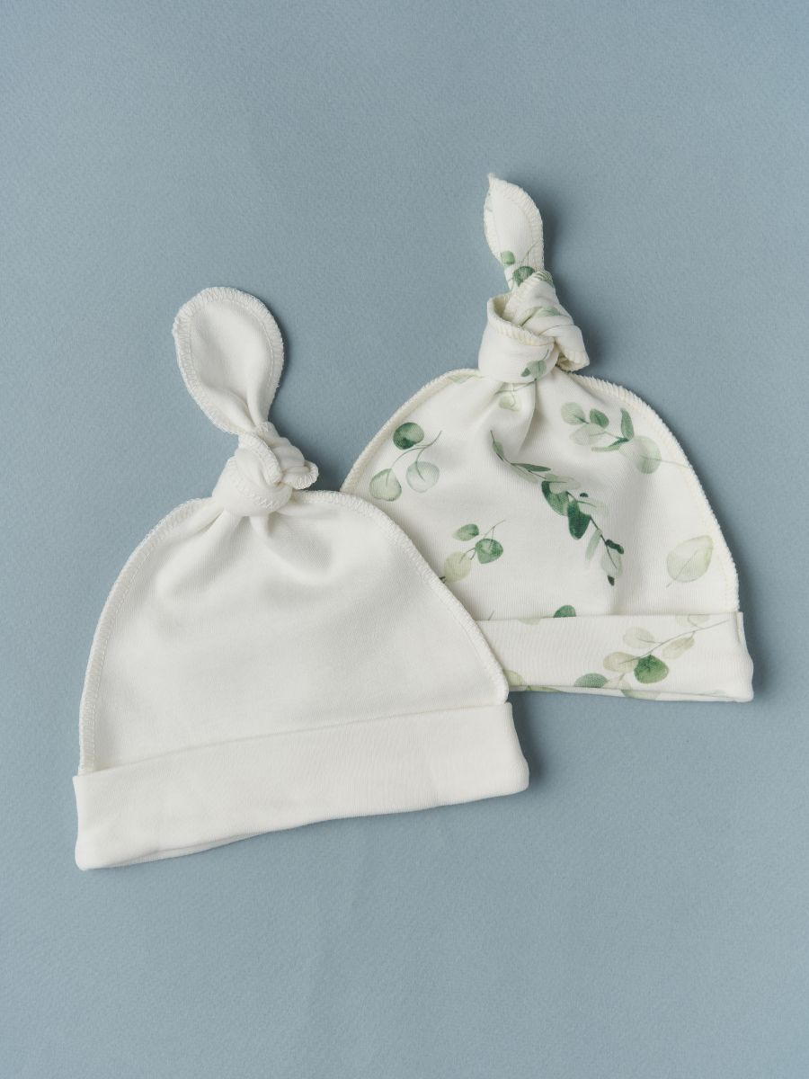 Комплект котелков для малыша. Шапочка выполнена из натурального хлопка. Ткань не будет раздражать голову. Модную и мягкую шапочку малыш может носить круглый год, защищая ушки от сквозняков и головку от перегрева на солнце. Декорирована декоративным узелком на затылке.