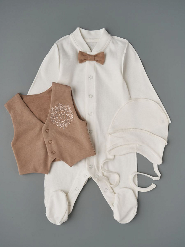 Красивый набор для выписки малыша из роддома. Комбинезон выполнен из 100% хлопка, швами наружу и украшен маленькой вышивкой на комбинезоне и чепчике. Чепчик однослойный с завязками, швами наружу. Комплект смотрится невероятно нежно и станет украшением для Вашей выписки в любое время года.